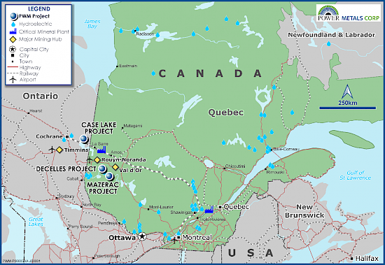 Figure 1 – Power Metals Corp Project Locations Map in Ontario and Quebec Canada